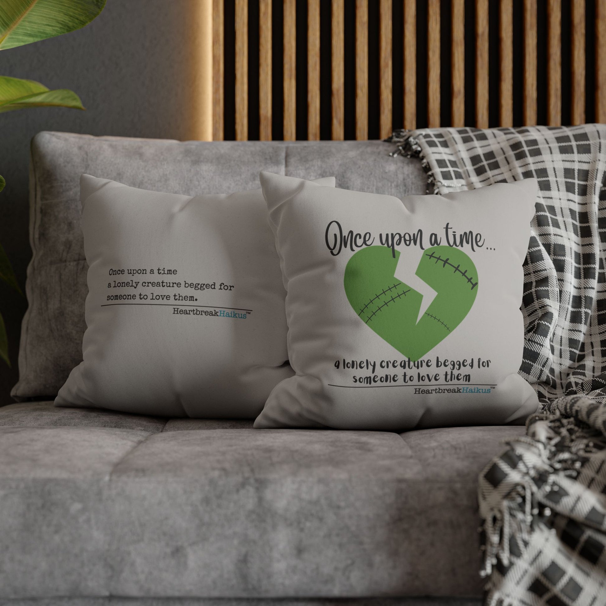 These beautiful indoor pillowcases are statement pieces, creating a personalized environment in bedrooms, living rooms, dens, and offices. Velvety soft for ultimate snuggles and comforting. Display on design side or poem only vintage typewriter font. Already own a HeartbreakHaikus throw pillow? Add to your collection with additional pillow cases! Great in sets of 2 for styling options.