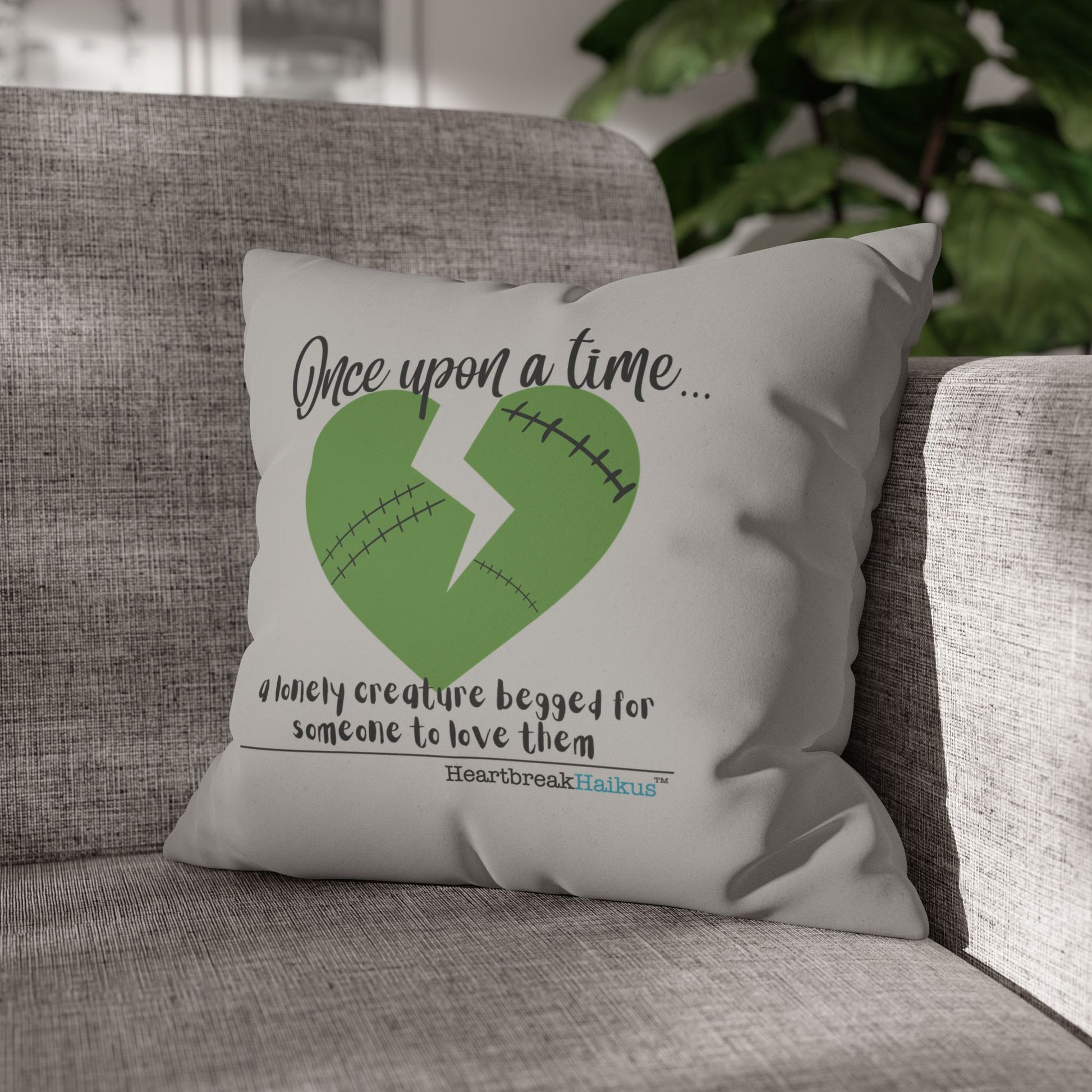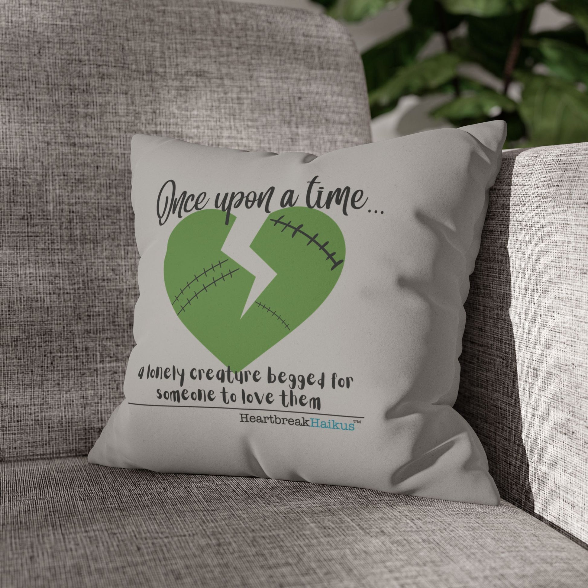 A Lonely Creature Begged Frankenstein Haiku - Faux Suede Square Pillowcase (in Light Grey)