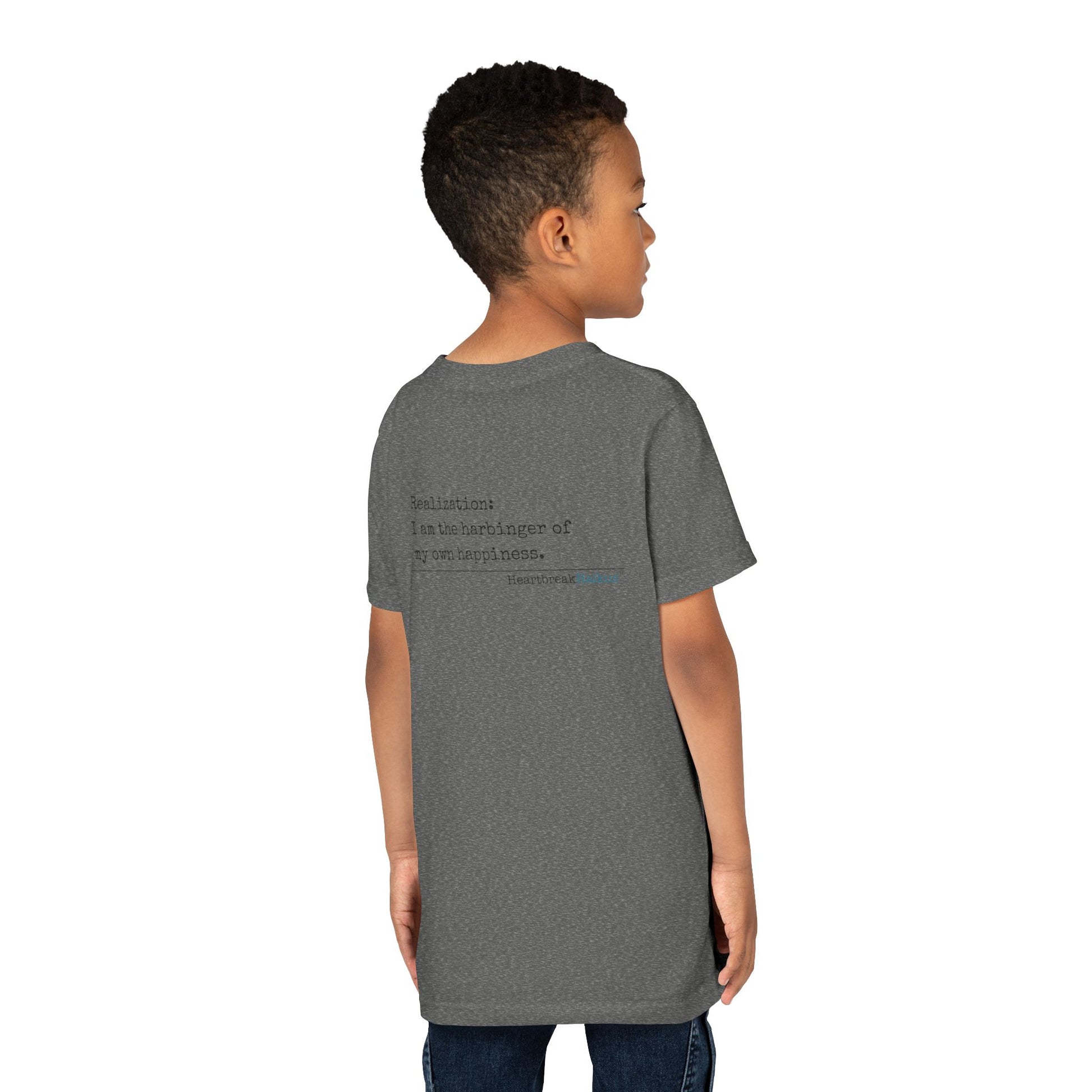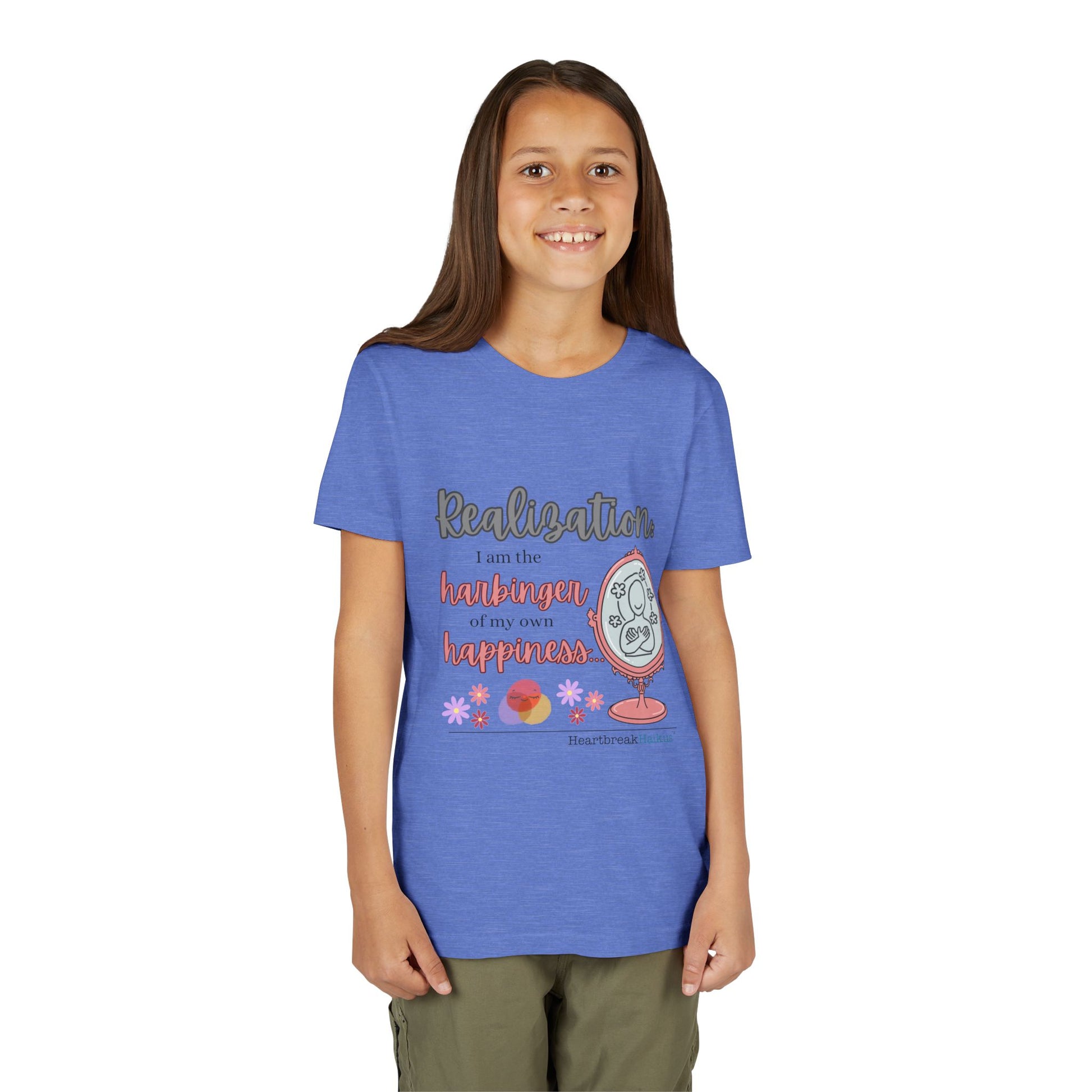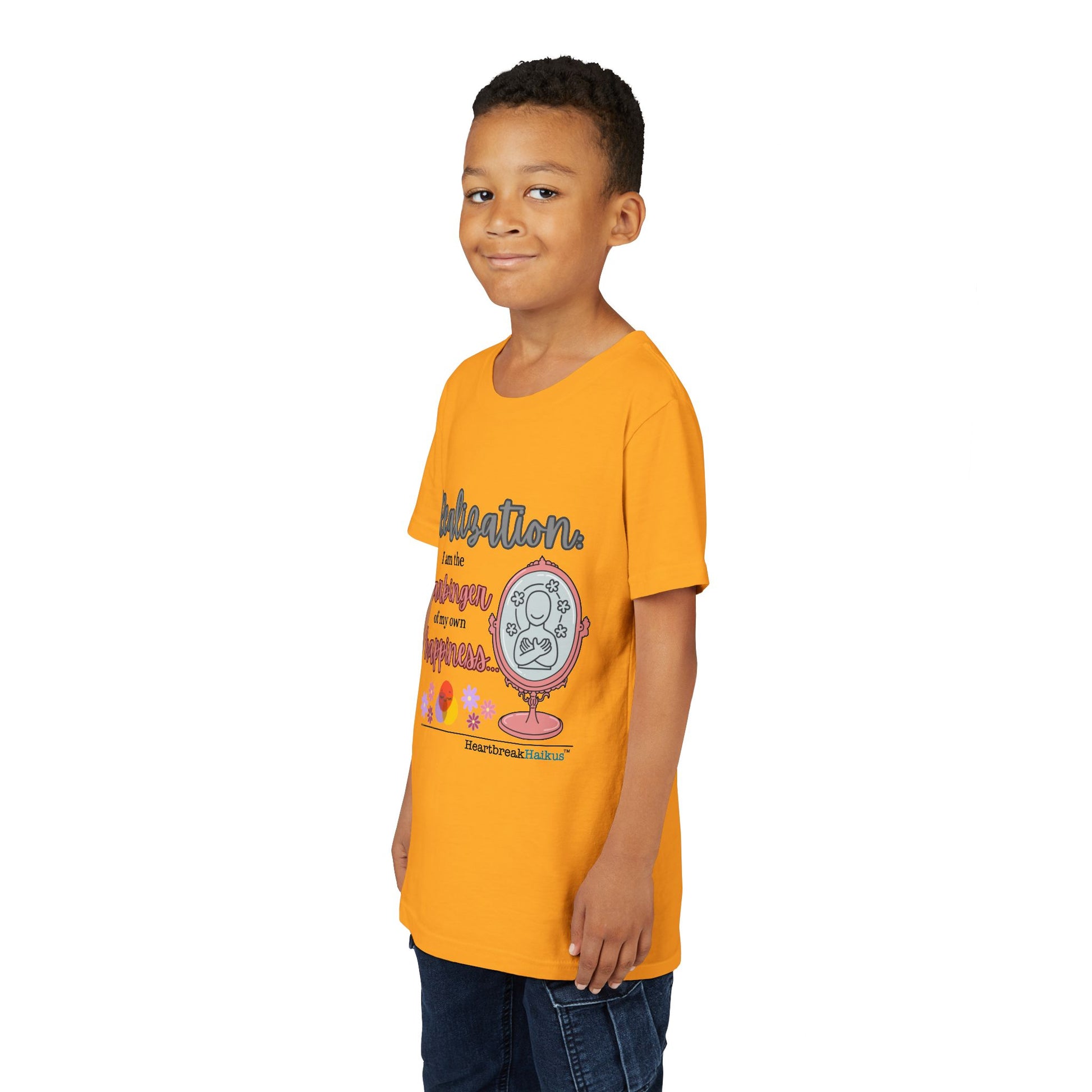 This charming Youth Short-Sleeve t-shirt features a unique and uplifting design that reminds your young ones of their power to create their own happiness. Perfect for school days, family outings, or weekend adventures. Its relaxed fit makes it versatile for layering under a hoodie or wearing solo, making it an essential in any child's wardrobe. The lightweight fabric is perfect for any season, ensuring they stay comfortable whether they're running around or relaxing at home.