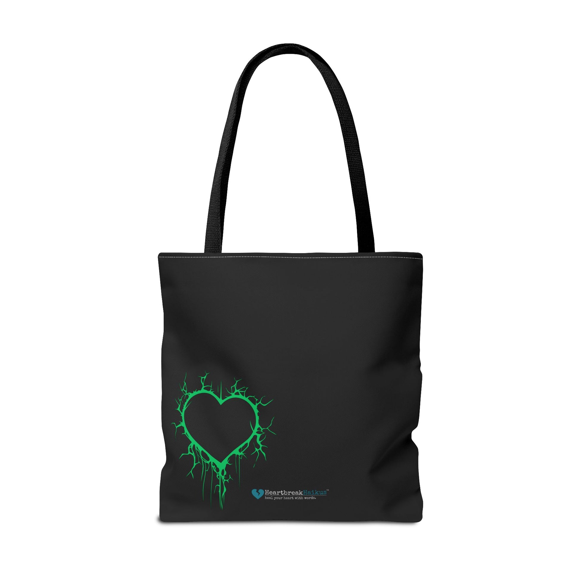 This black polyester tote from Heartbreak Haikus (The Only Hearts Collection) carries a bold, rebellious heartbeat — an electric, wicked-green, cracked heart dripping with details that reads like wearable street art. The lightweight but sturdy fabric keeps its shape while the boxed corners add roomy depth for daily essentials. Reinforced handles and matching inner seams mean it stands up to heavy use. Bring it to markets, concerts, campus...anywhere. The perfect blend of edgy style and practicality that still makes a statement.
