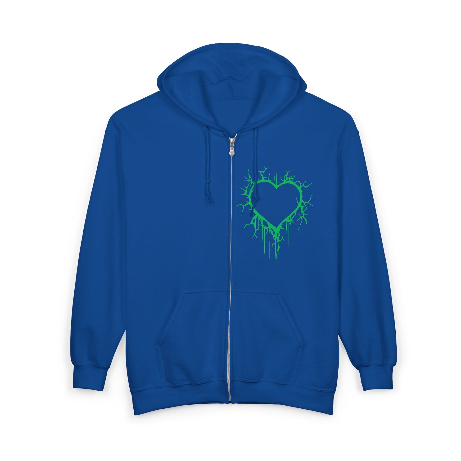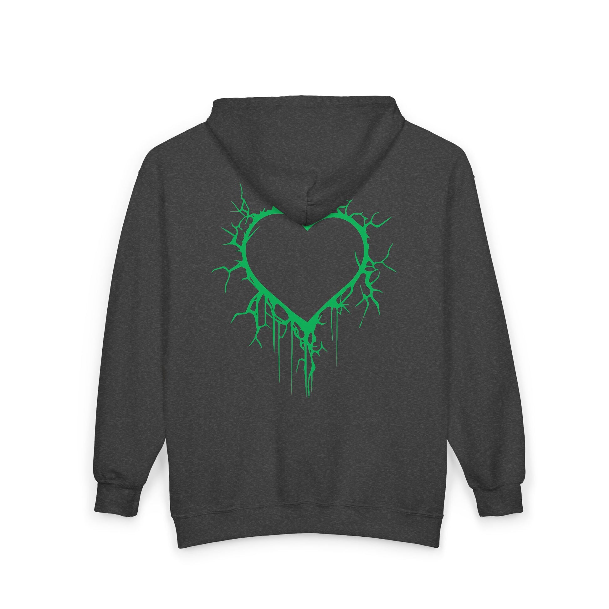 This soft, mid-weight zip hoodie carries an edge: a cracked, electrifying heart embroidered with electric-green thread on the left chest and larger across the back. The hood cinches down with a woven drawstring and the roomy pockets hold phone, keys, and a small notebook. The fabric’s cotton-poly blend gives structure and warmth while still being breathable, so it becomes a go-to layer that ages with you and the stories you collect.