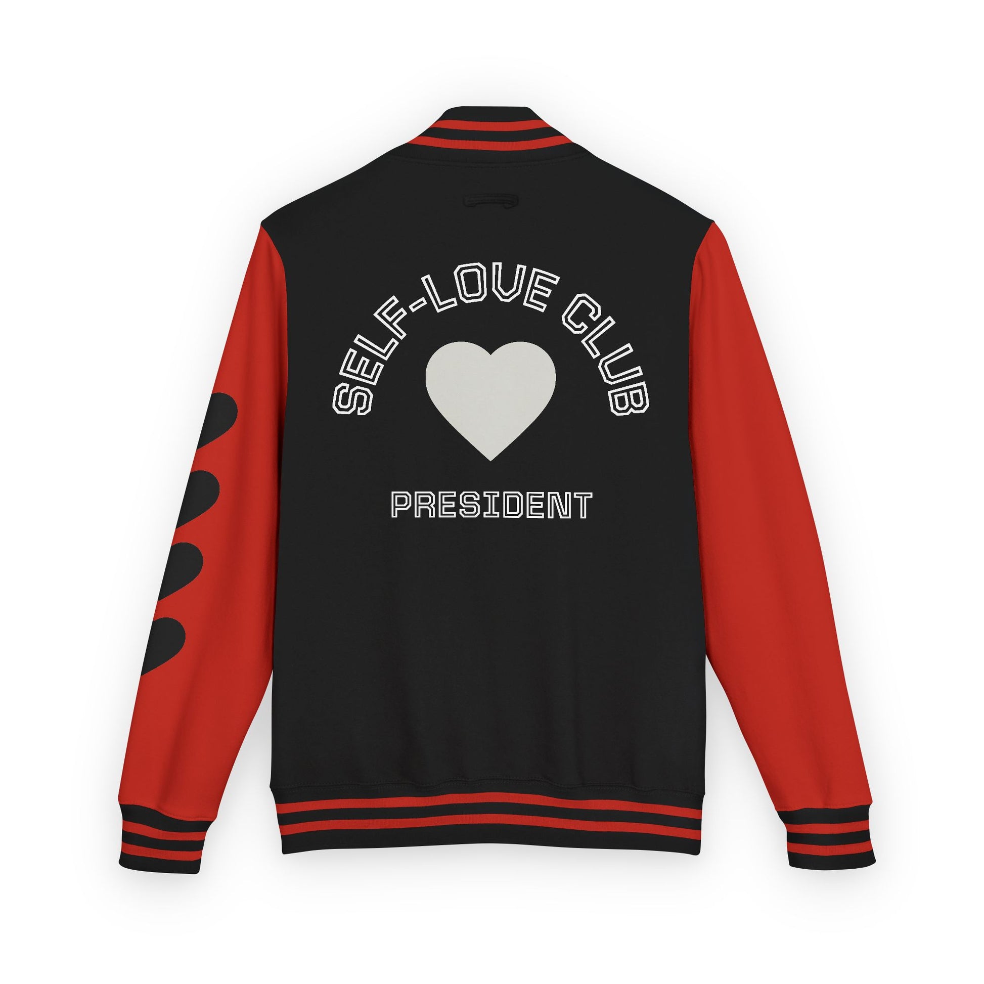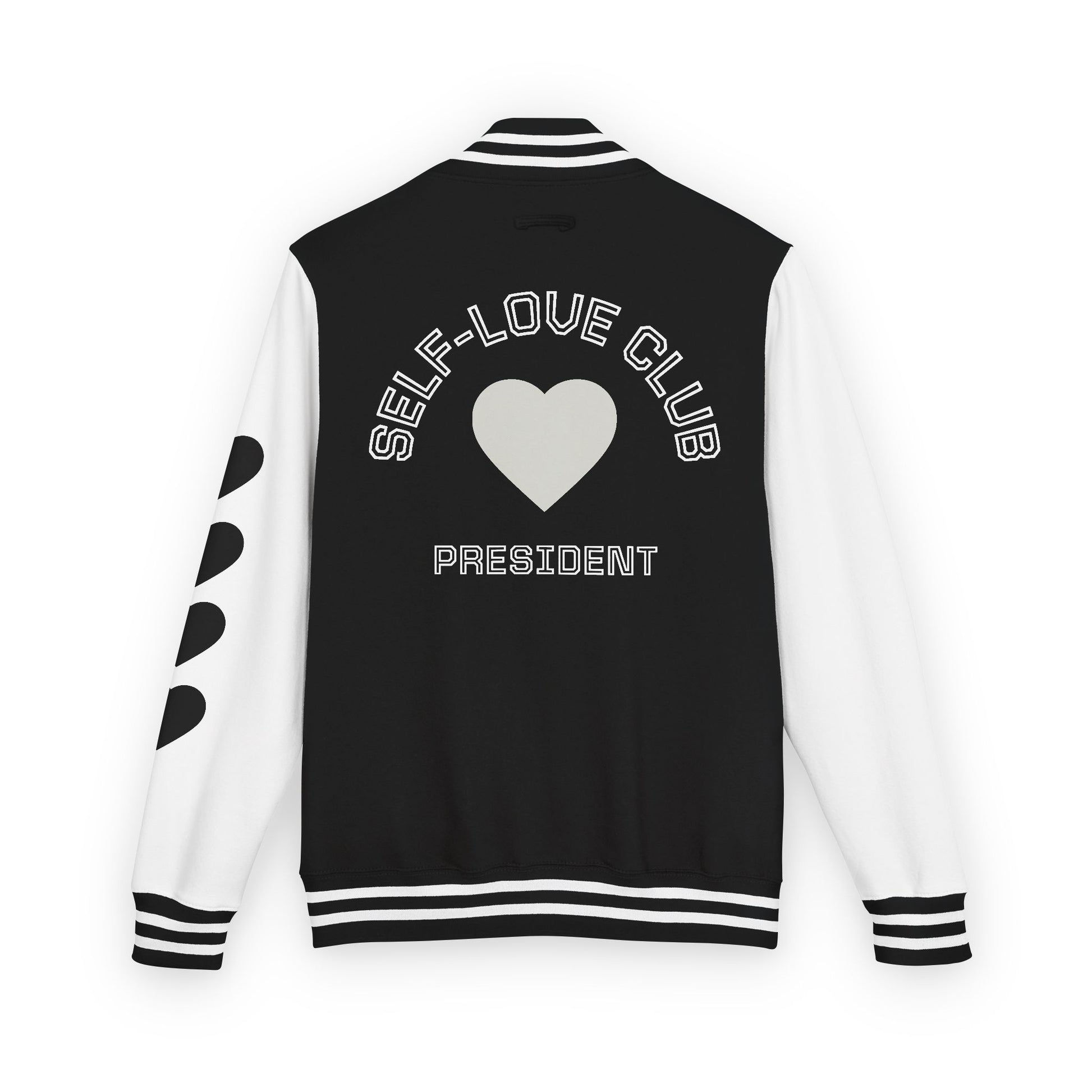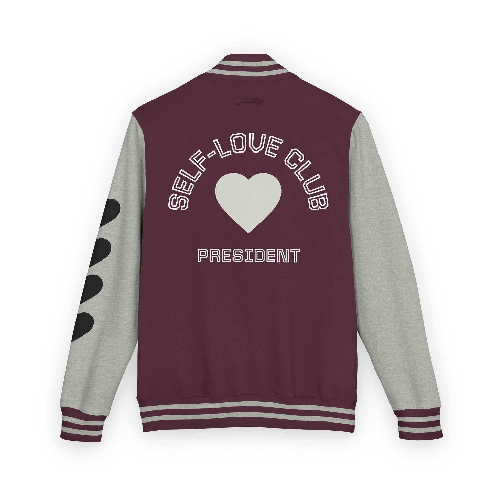 This vintage-inspired, letterman-style jacket channels late-night diner runs, mixtape confessions, and the quiet camaraderie of those who wear their hearts on their sleeve. Deep colors and bold varsity striping—paired with a heart over the chest and a larger “Self-Love Club President” badge on the back—creates a look that’s both nostalgic and rebellious. Soft, garment-dyed fabric and medium-heavy weight give it a broken-in feel from the first wear. Slip it on this jacket for chilly evenings, road-trip playlists, or meetups with friends!