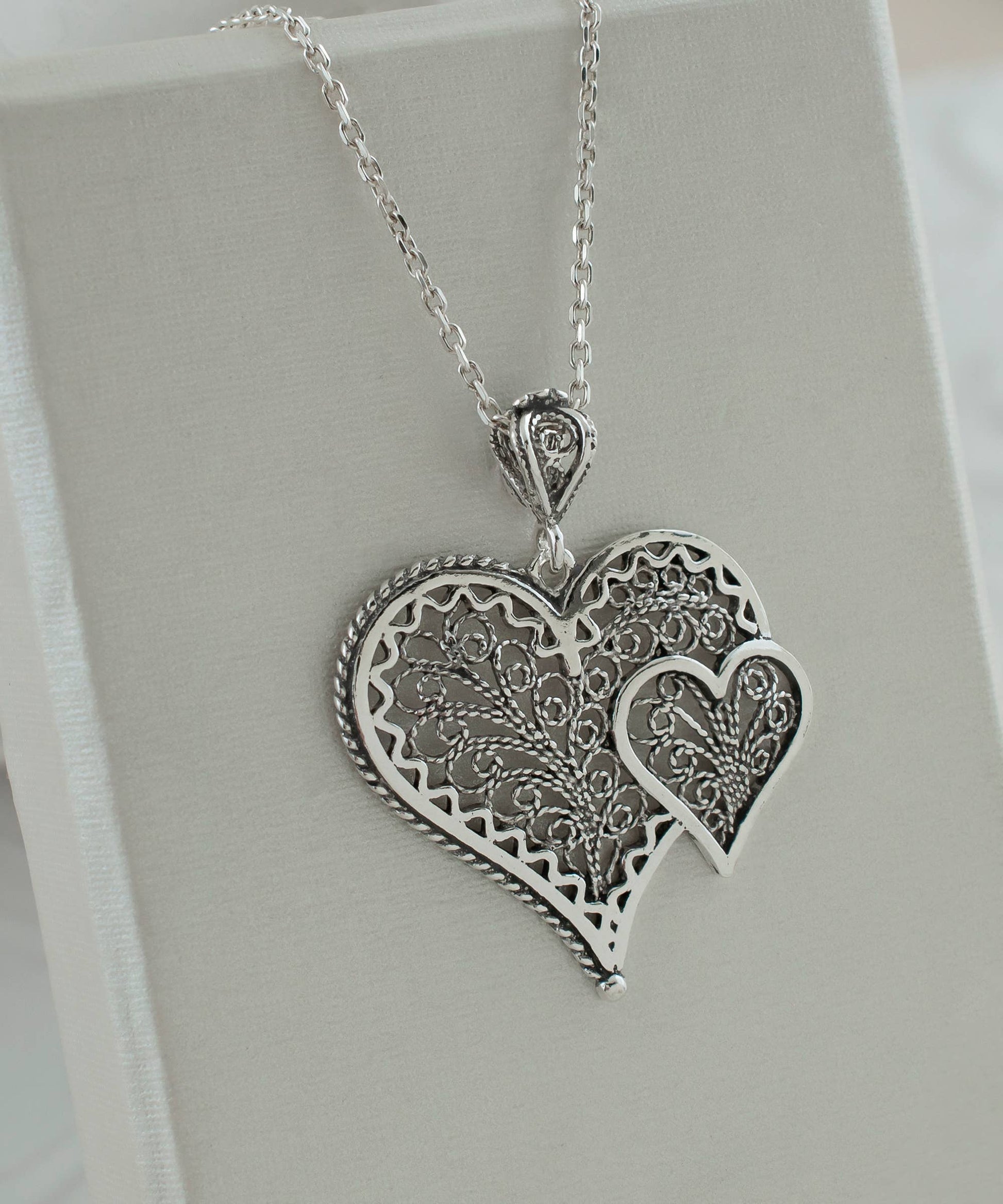This 925 Sterling Silver handcrafted filigree art heart to heart pendant necklace comes with 20" silver chain option. The pendant height is 1.65" / 42.50 mm and the width is 1.20" / 30.50 mm. The sterling silver chain is 18.00"+2.00" / 50 cm with extension and spring close closure. It is oxidized and highly polished.