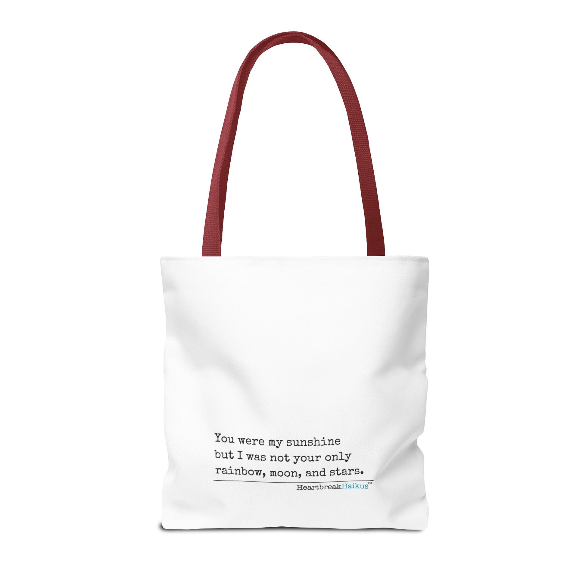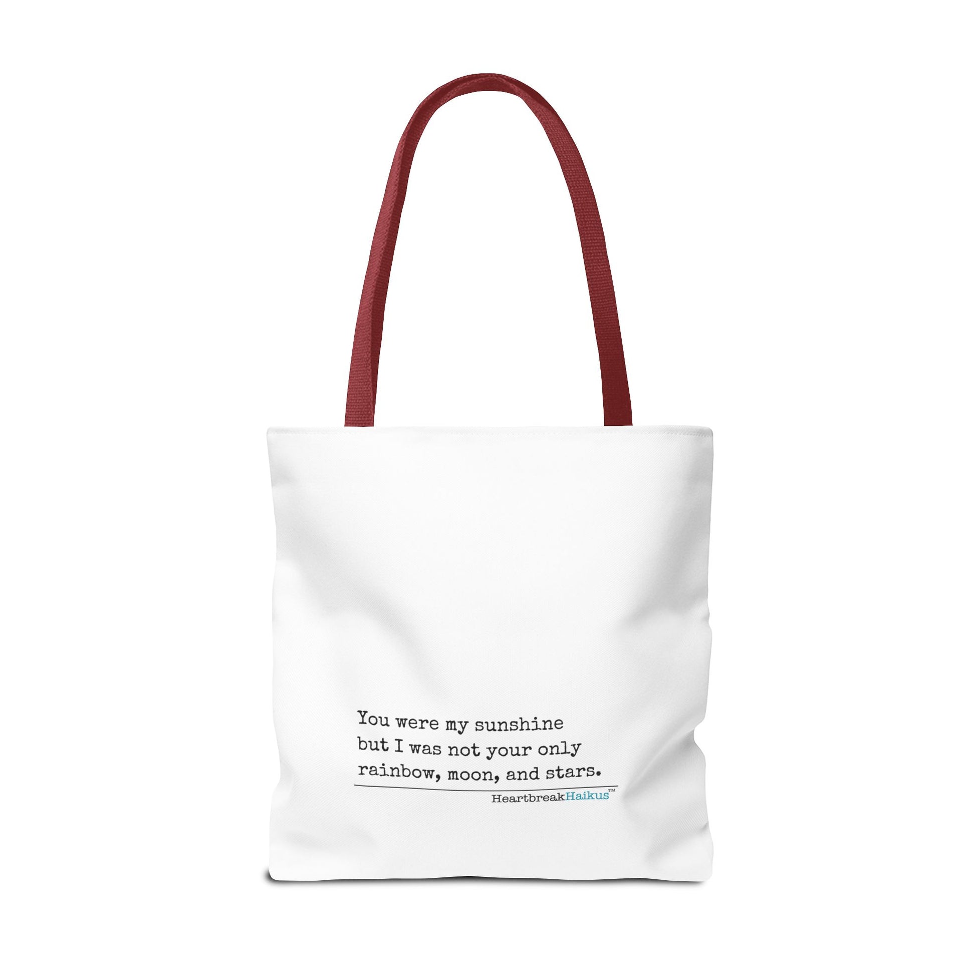 Available in 3 sizes to add both functionality and style, these dual-sided, printed tote bags come with multiple handle colors options to match your style. Made with spun polyester, these bags feature double-stitched seams, cotton webbing straps, and nonwoven laminate lining for high-end durability. Double-sided design. Illustration on one side; text-only haiku in vintage typewriter font on the other! Feeling colorful and sassy or in the mood for a sleek monochromatic look? You decide....